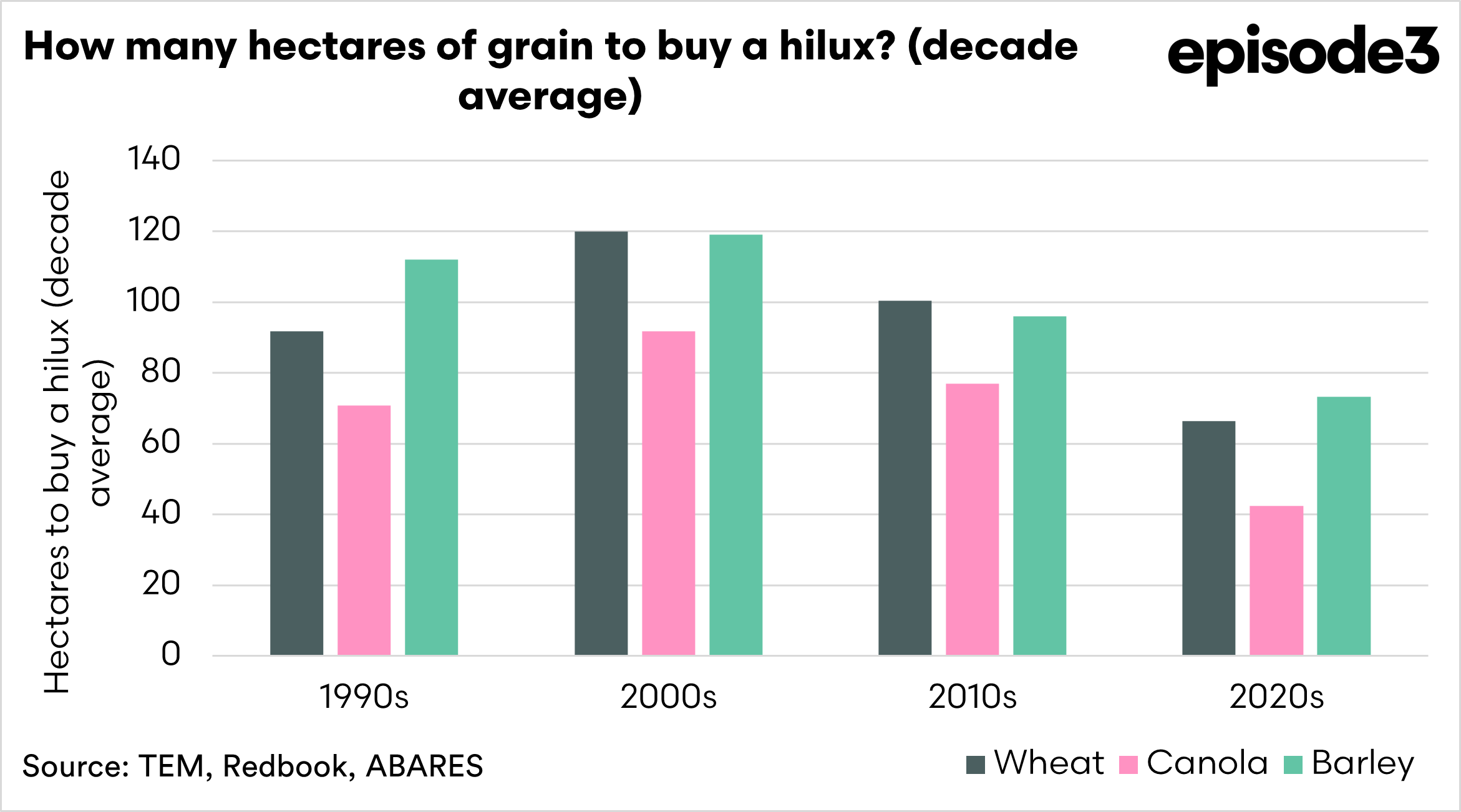If we look at the period from the 1990s to the present, this current decade has actually been the best for farmers to invest in a ute. On average, you’d use fewer hectares to purchase the same ute specification.