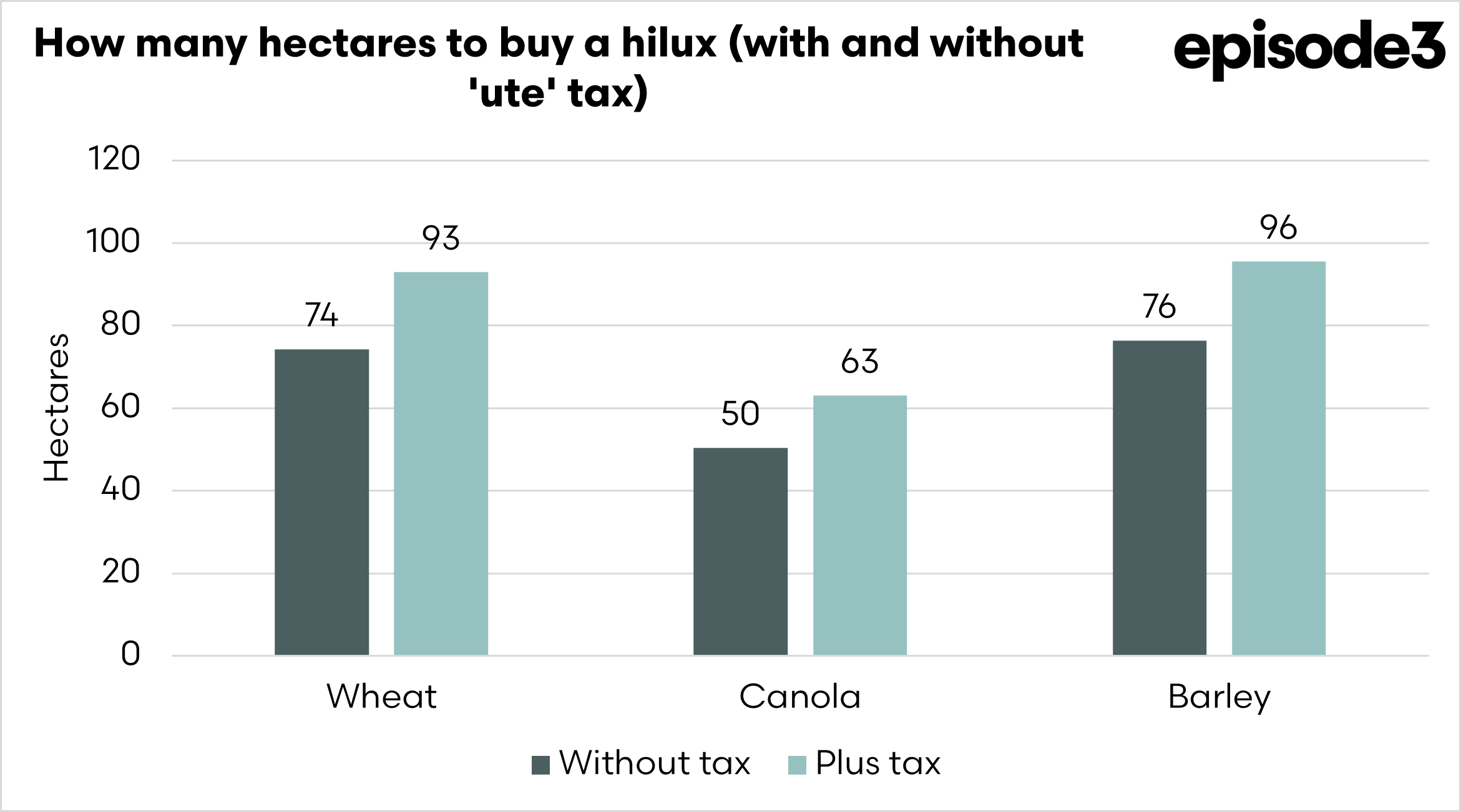 - The ‘ute tax’ based on media-quoted figures would have meant that 18ha of wheat, 12ha of canola or 19ha of barley would be required to cover the costs of a new hilux in 2023.