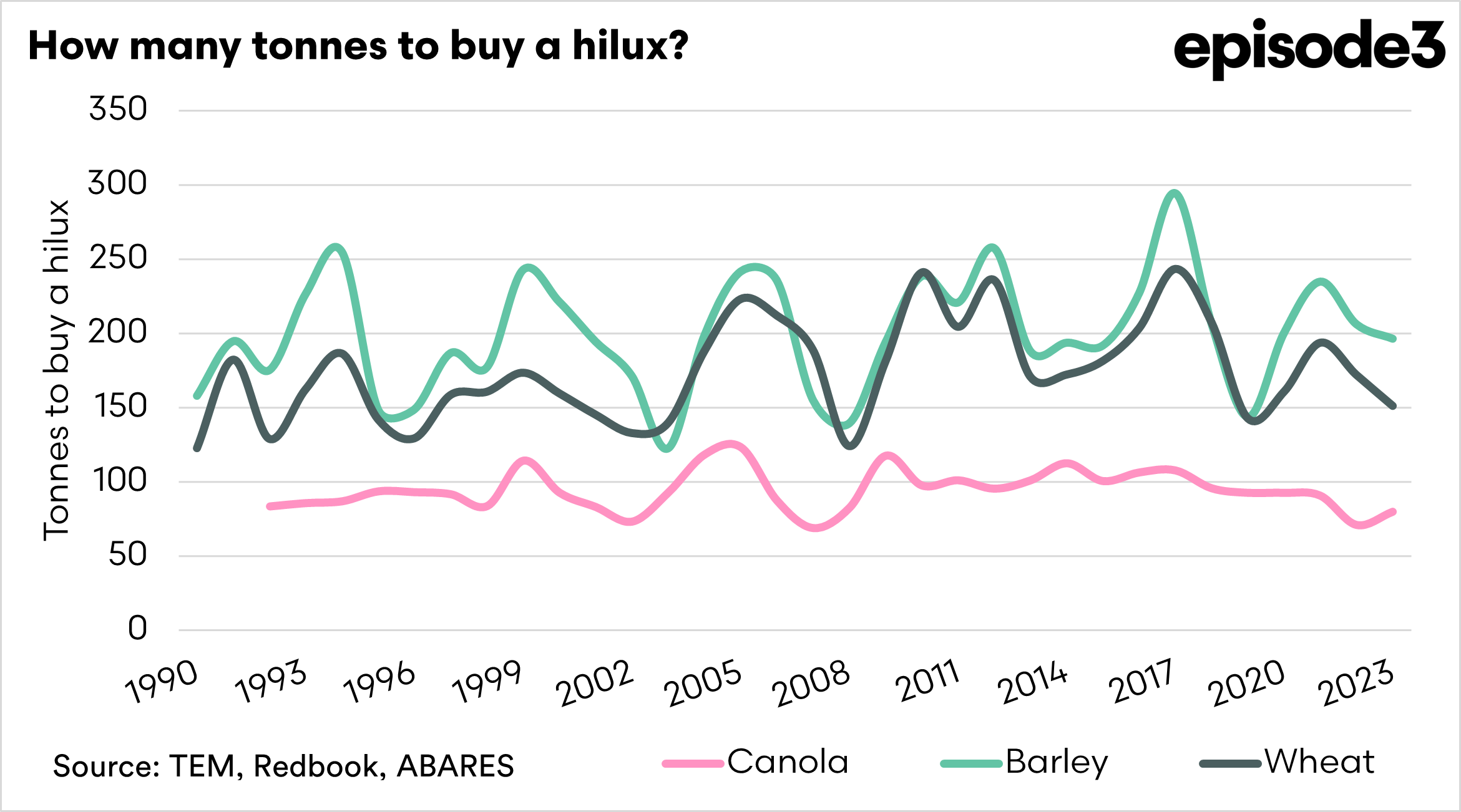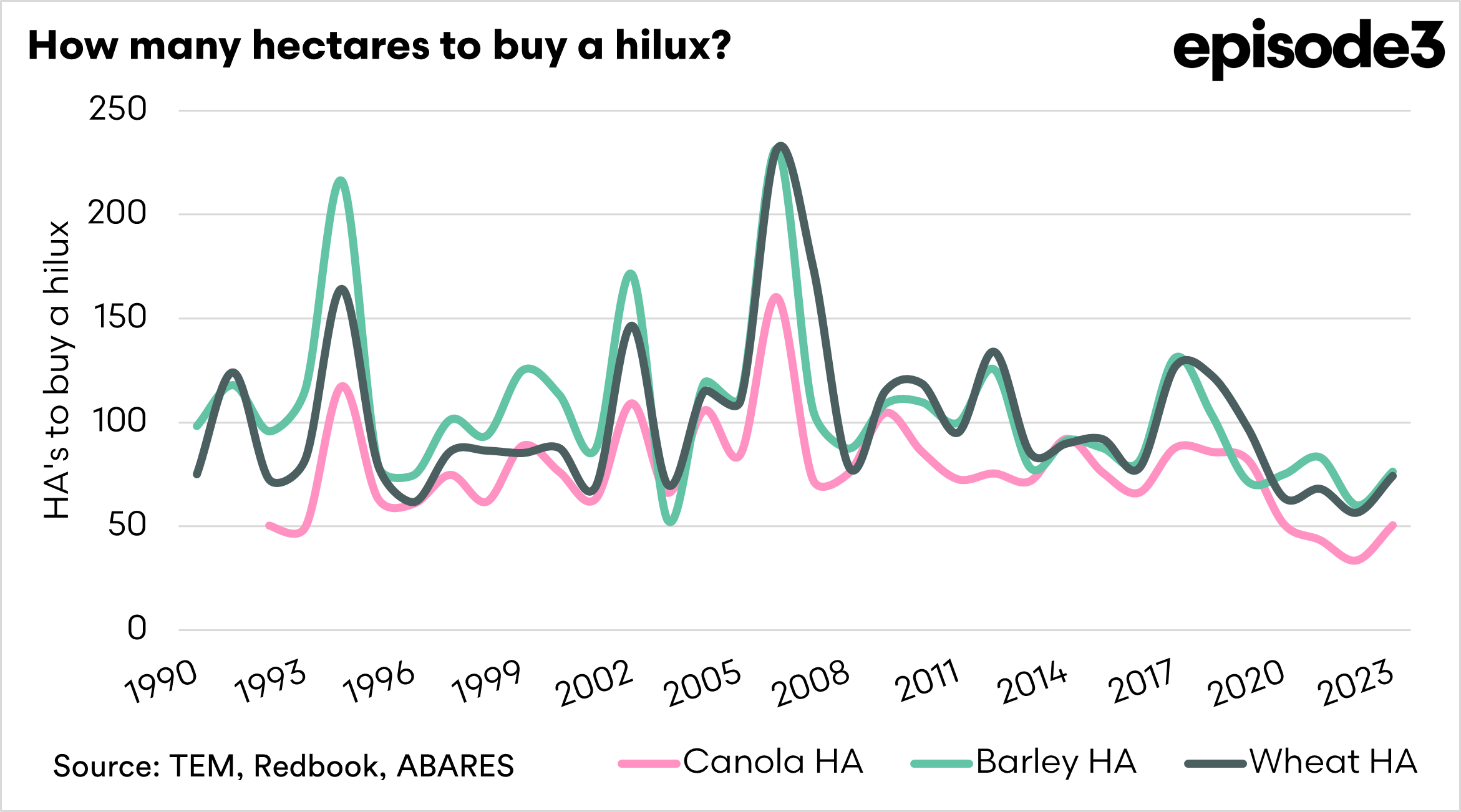 This requires a significant additional area to be grown to cover the costs of a Hilux. 2023 was also a decent year for buying a Hilux (5-8th best in 32 years); not all years will have the same price/yields.