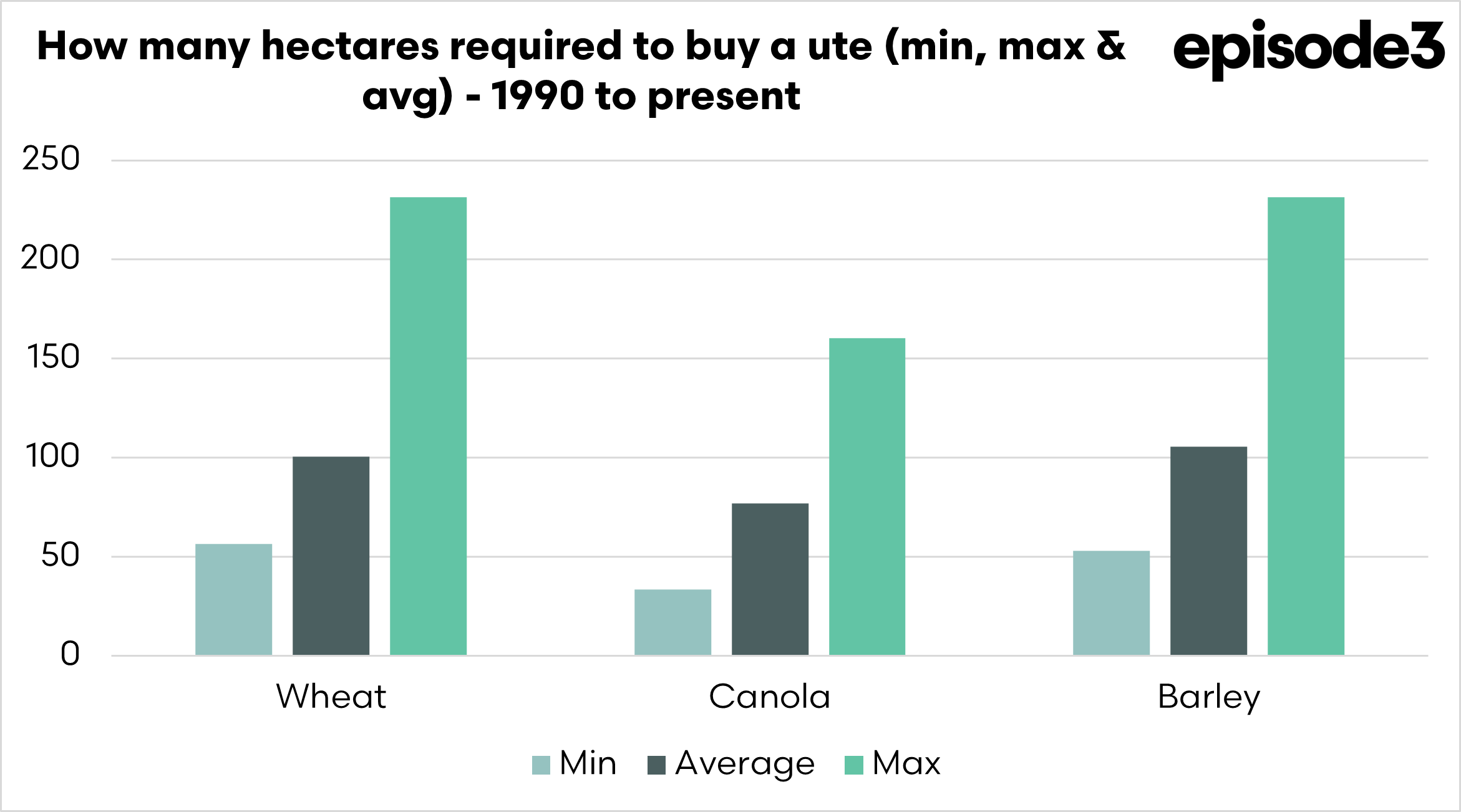 Last year, a below-average volume of grain was required to buy a ute, but we need to look closer and examine the amount of area required.